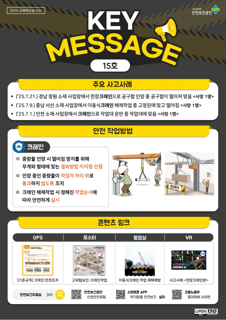 안전보건공단 안전보건자료실에 키메세지(15호_크레인) 자료가 게시되었으니