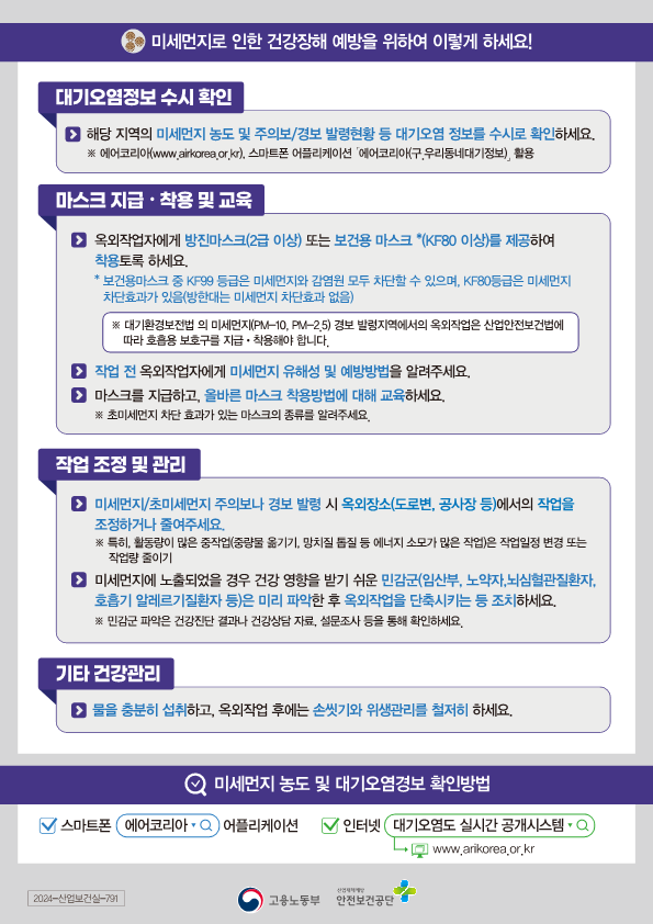 본 저작물은 안전보건공단에서 2024년 작성하여 공공누리 제4유형으로 개방한 '미세먼지 건강장해 예방 가이드'를 이용하였으며,