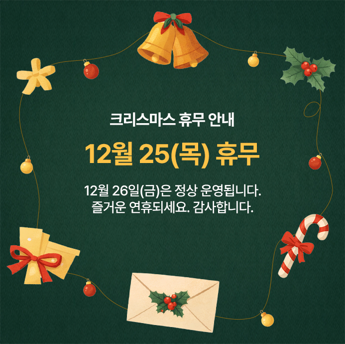 2025년 12월 25일(목) 크리스마스 및 2026년 01월 01일(목) 신정 휴무 안내 드립니다.